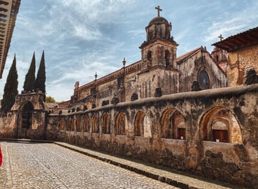 Su arquitectura tradicional —calles empedradas, muros blancos y techos de teja— forma uno de los conjuntos urbanos más bellos de Michoacán.